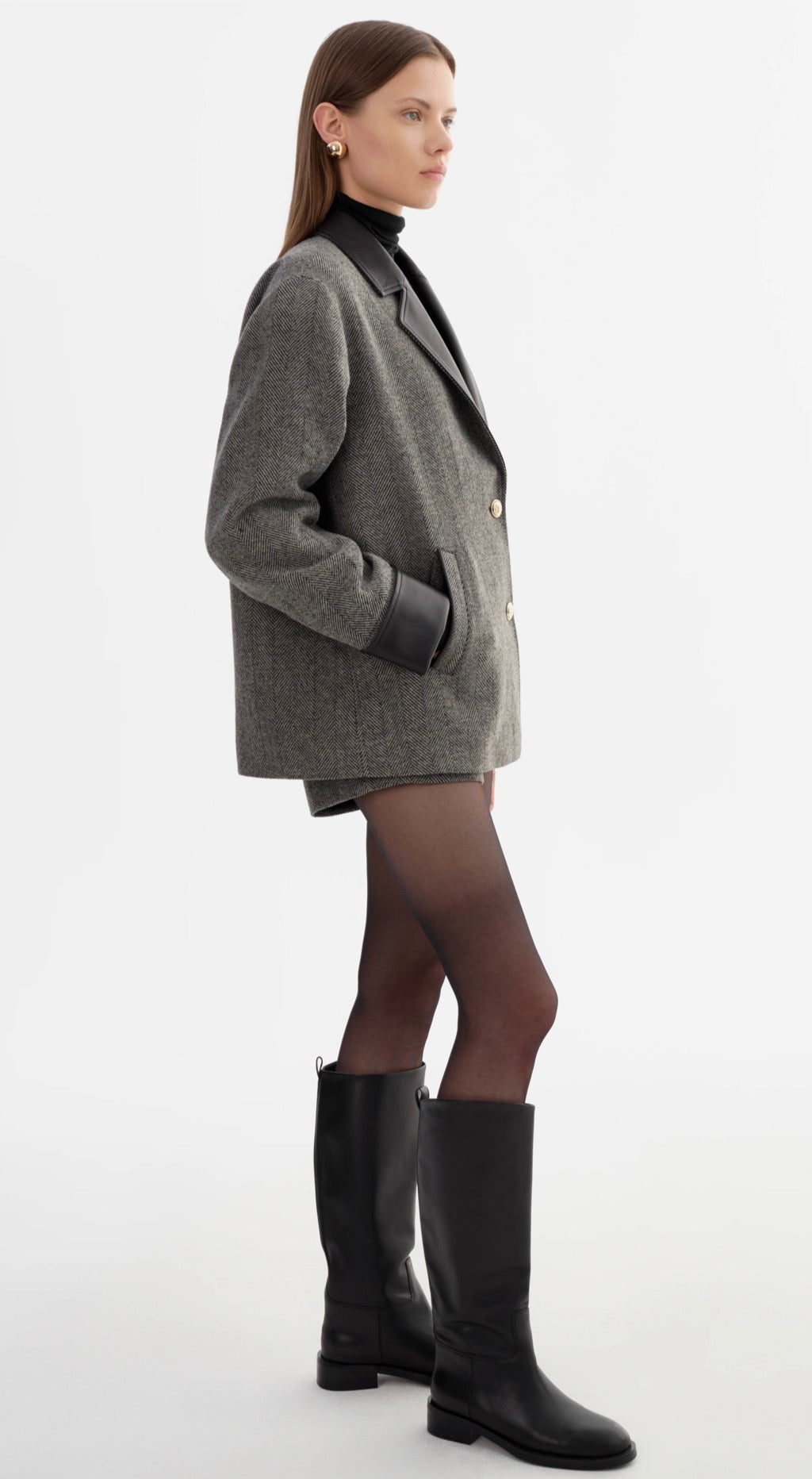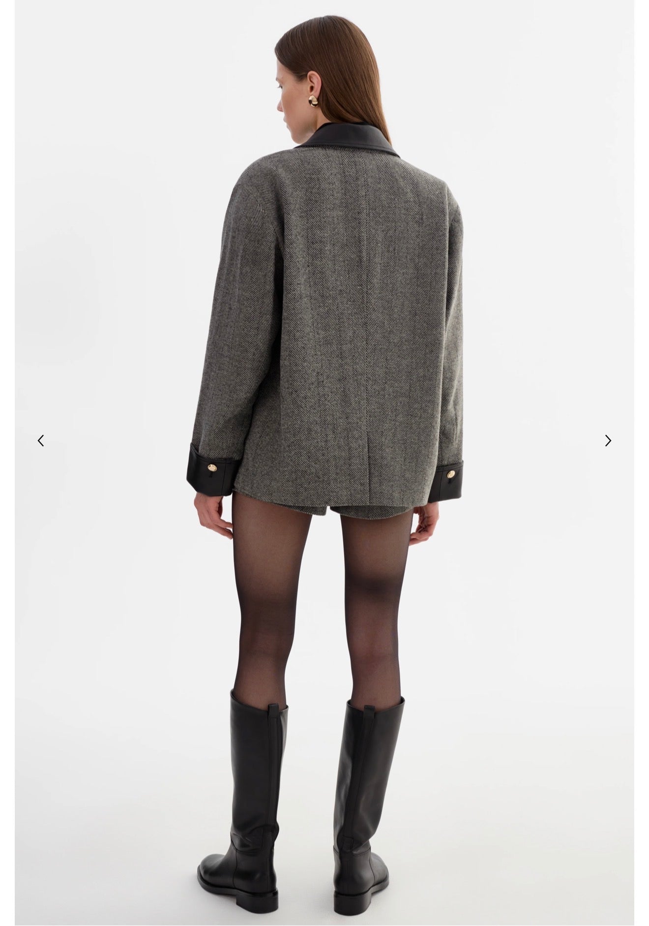 A modern update on classic tailoring. Crafted in twill tweed fabric with leather accents at the collar and cuffs, the EVIE blazer is cut in an oversized silhouette with sharp shoulders and polished gold-tone buttons. A standout layer that brings structure and edge to everyday looks.