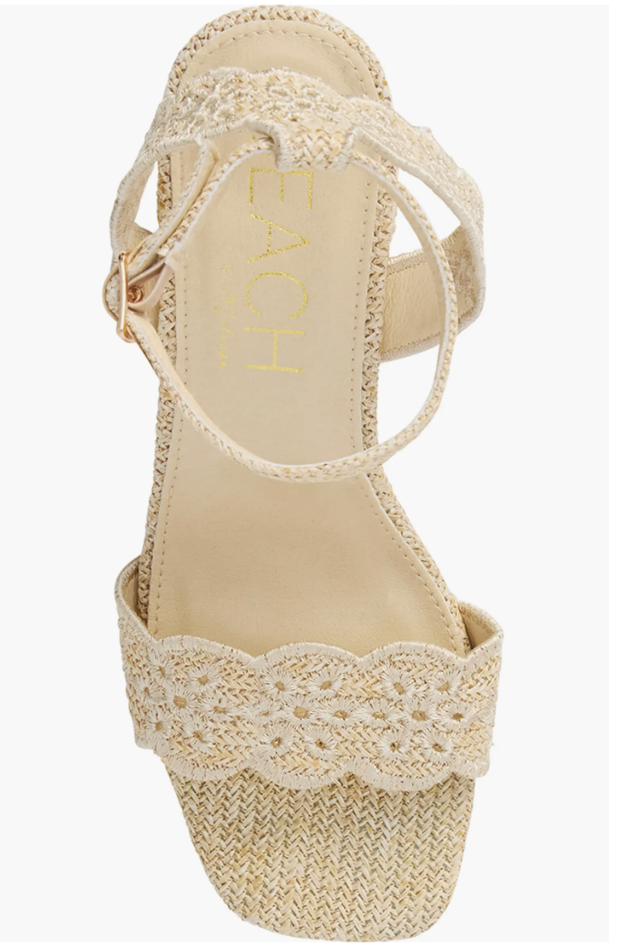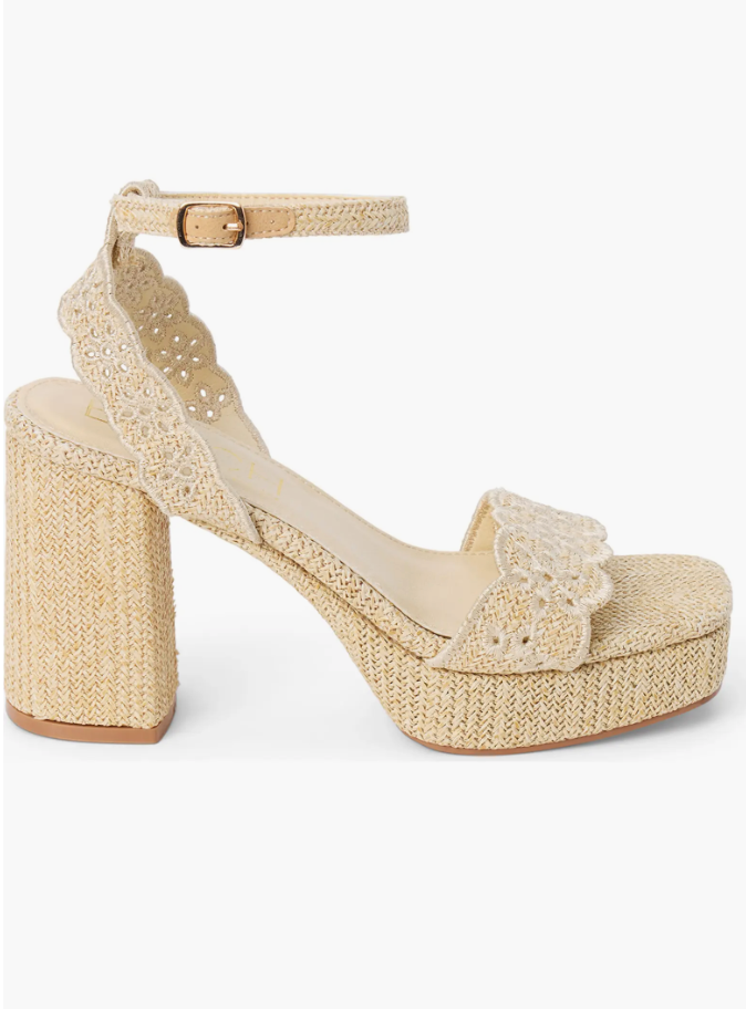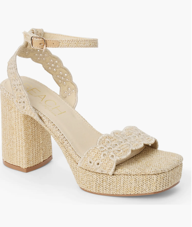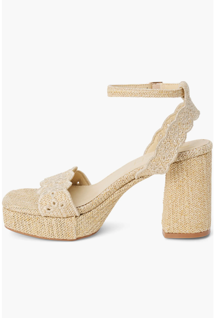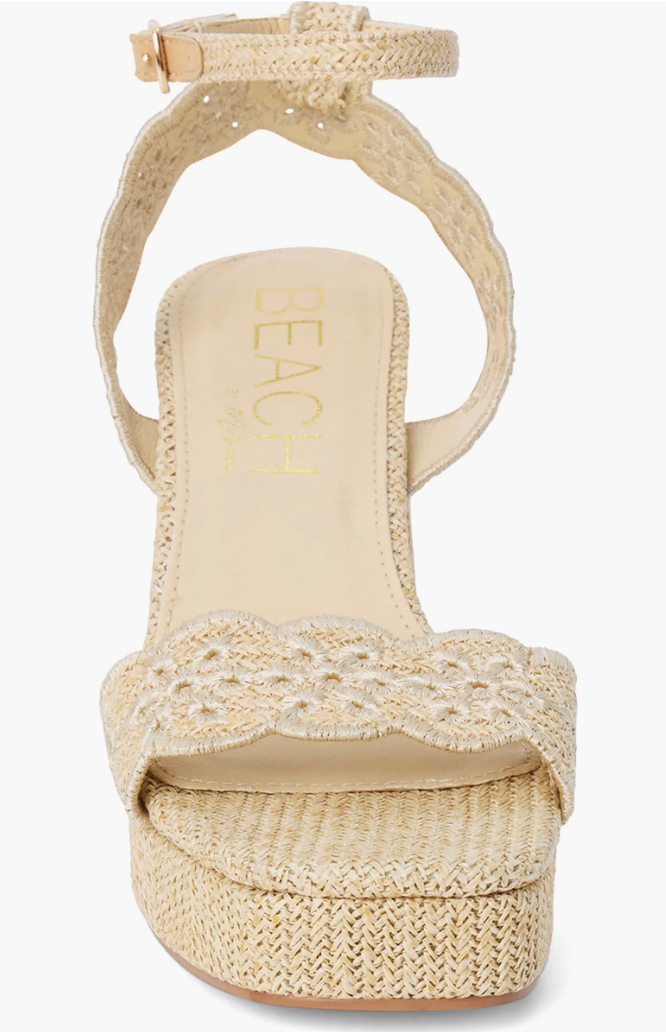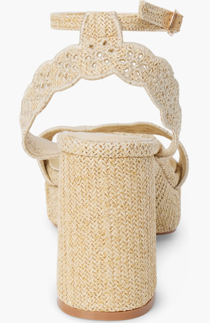Scalloped straps add to the summery vibe of this woven sandal boosted on a chunky platform and block heel.
