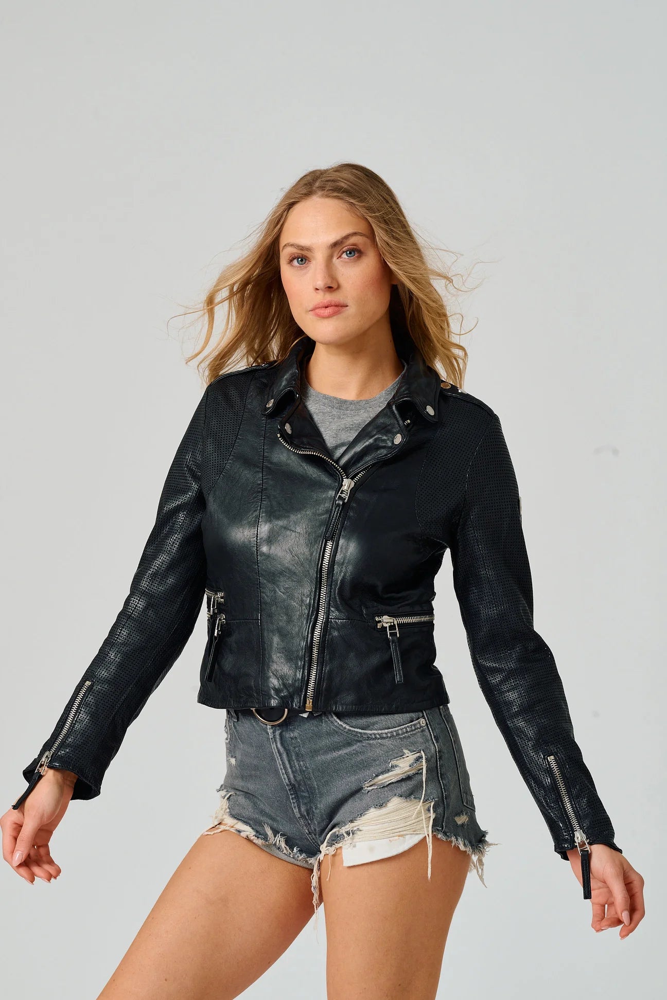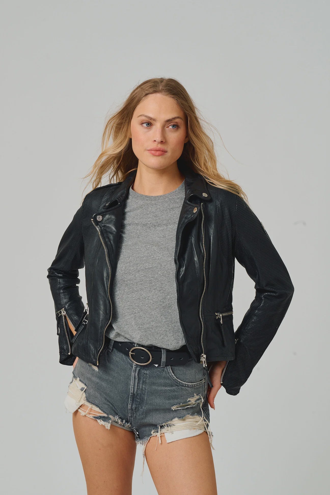 The Hera Leather Jacket pairs classic moto styling with modern edge. Perforated leather panels add breathability, while adjustable waist zippers create a sharp, customized silhouette.
