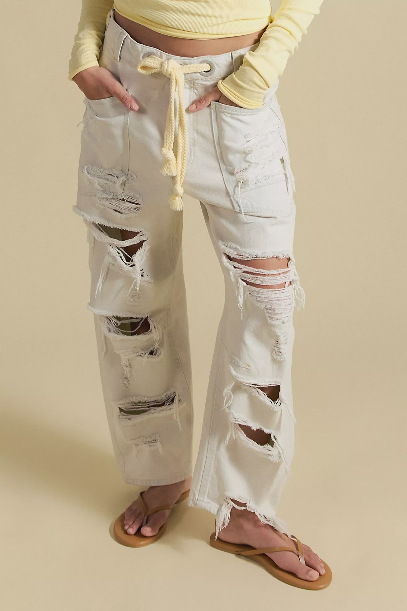 Features: Distressed detailing throughout, paint splatter features, oversized patch pockets, contrast drawstring waist, pull-on style