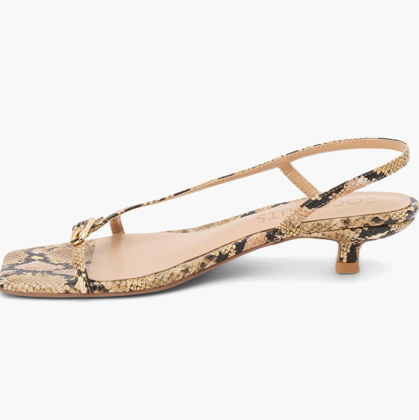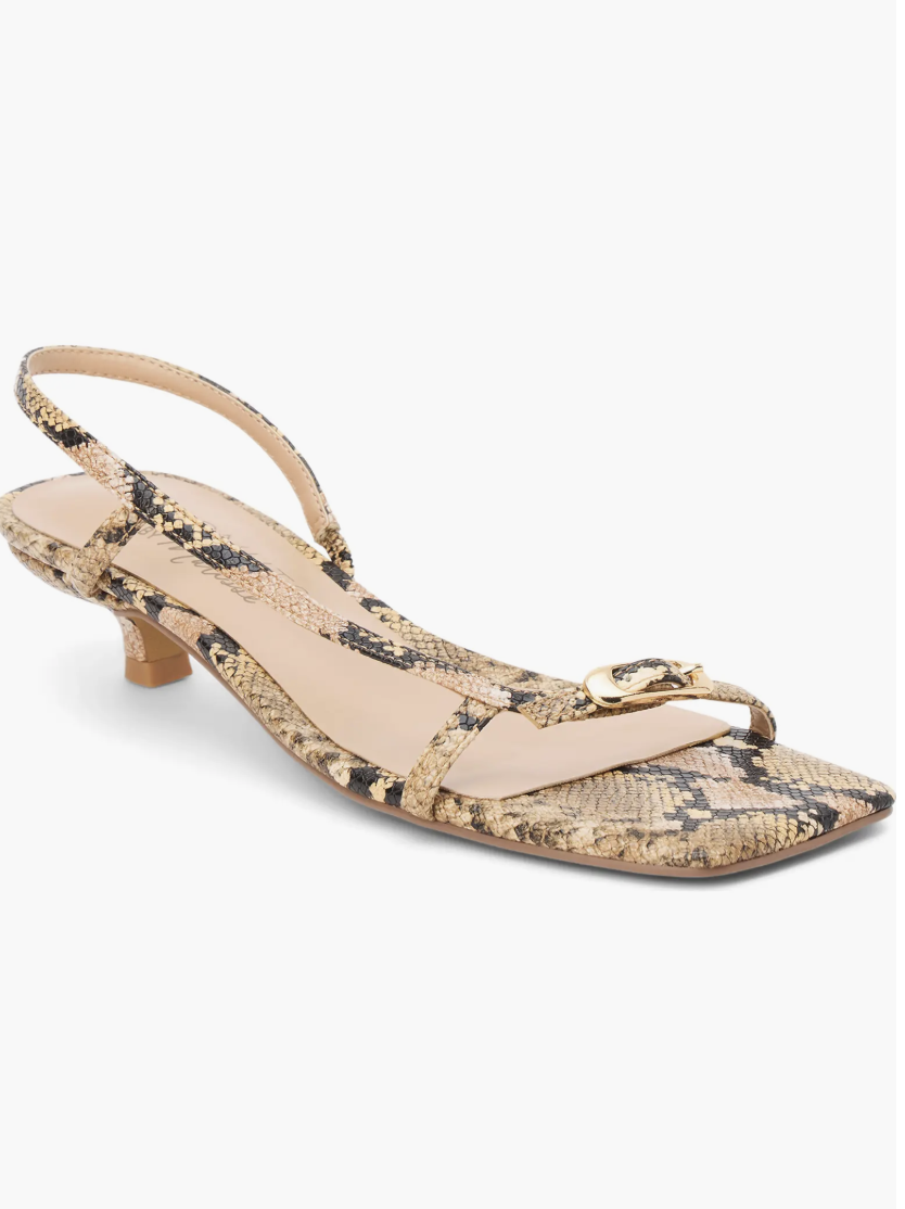 Polished buckle hardware provides an impeccable finishing touch for a slingback sandal that's a modern go-to style.