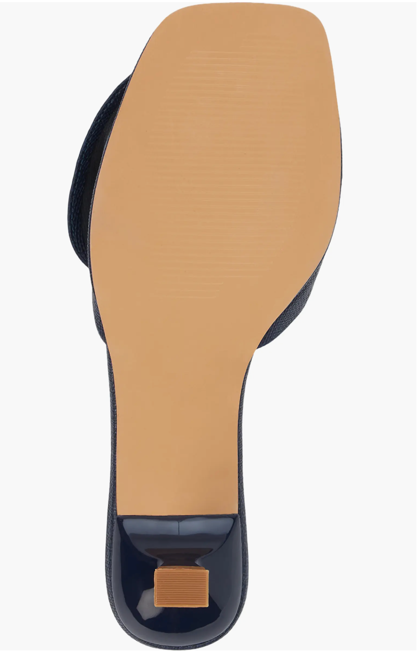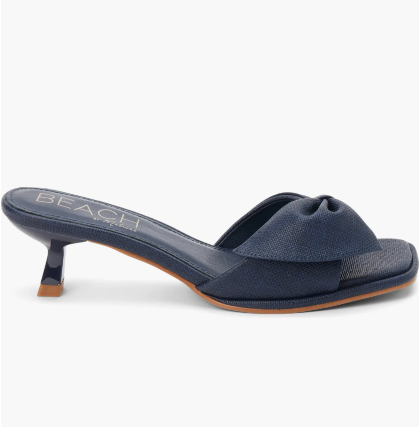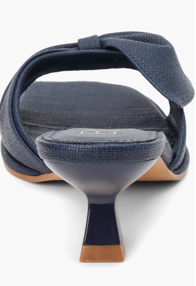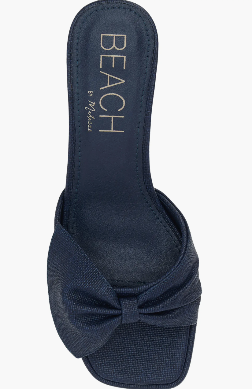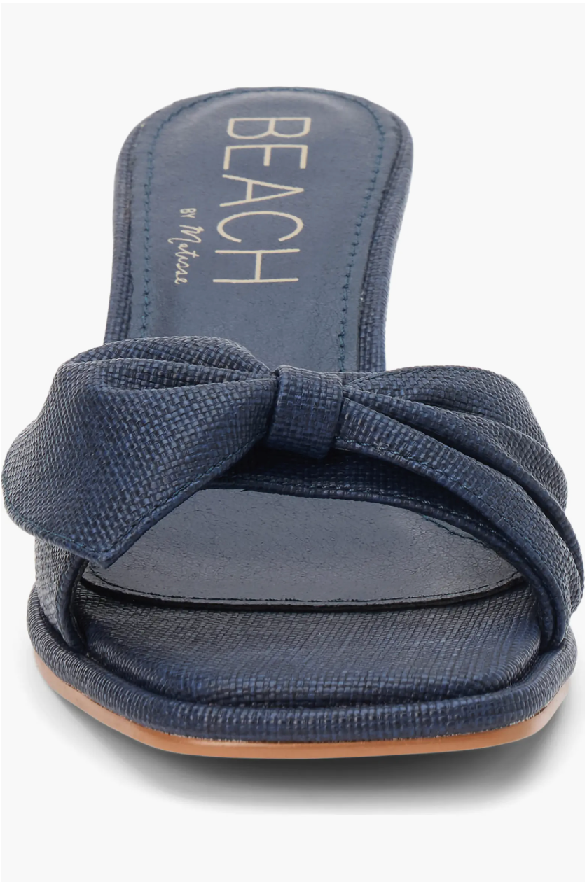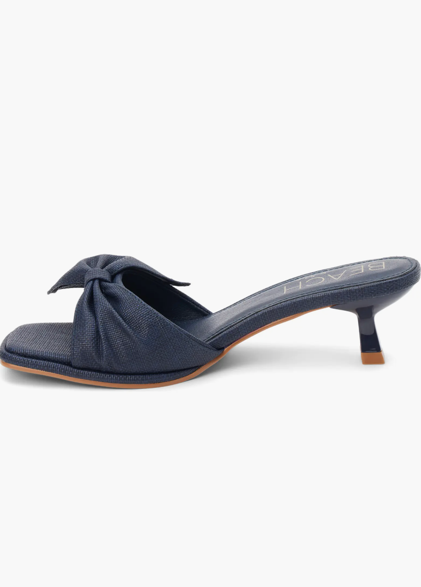 An asymmetric bow highlights the finely woven upper of a square-toe slide sandal set on a kitten heel for a subtle dose of height.