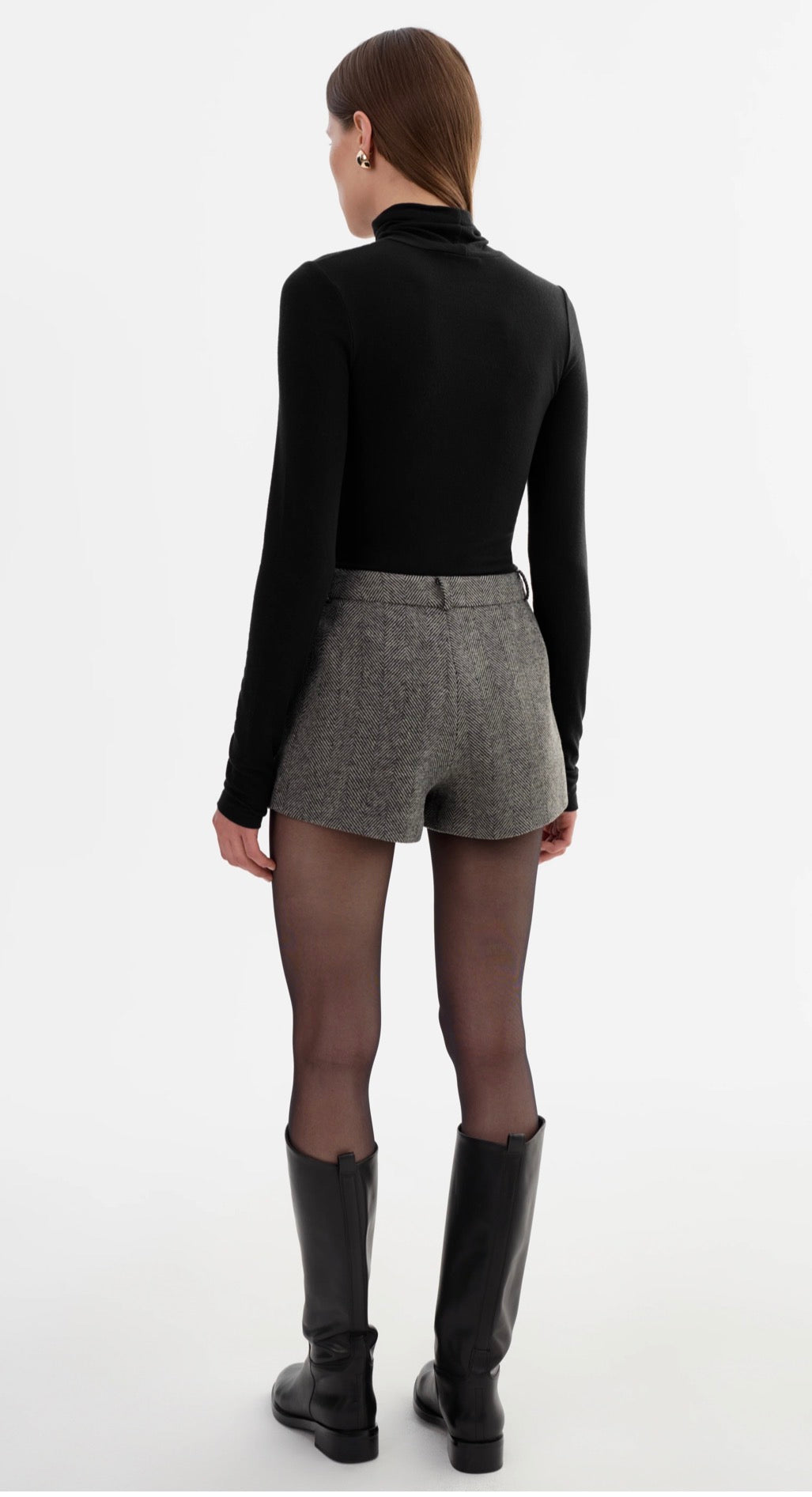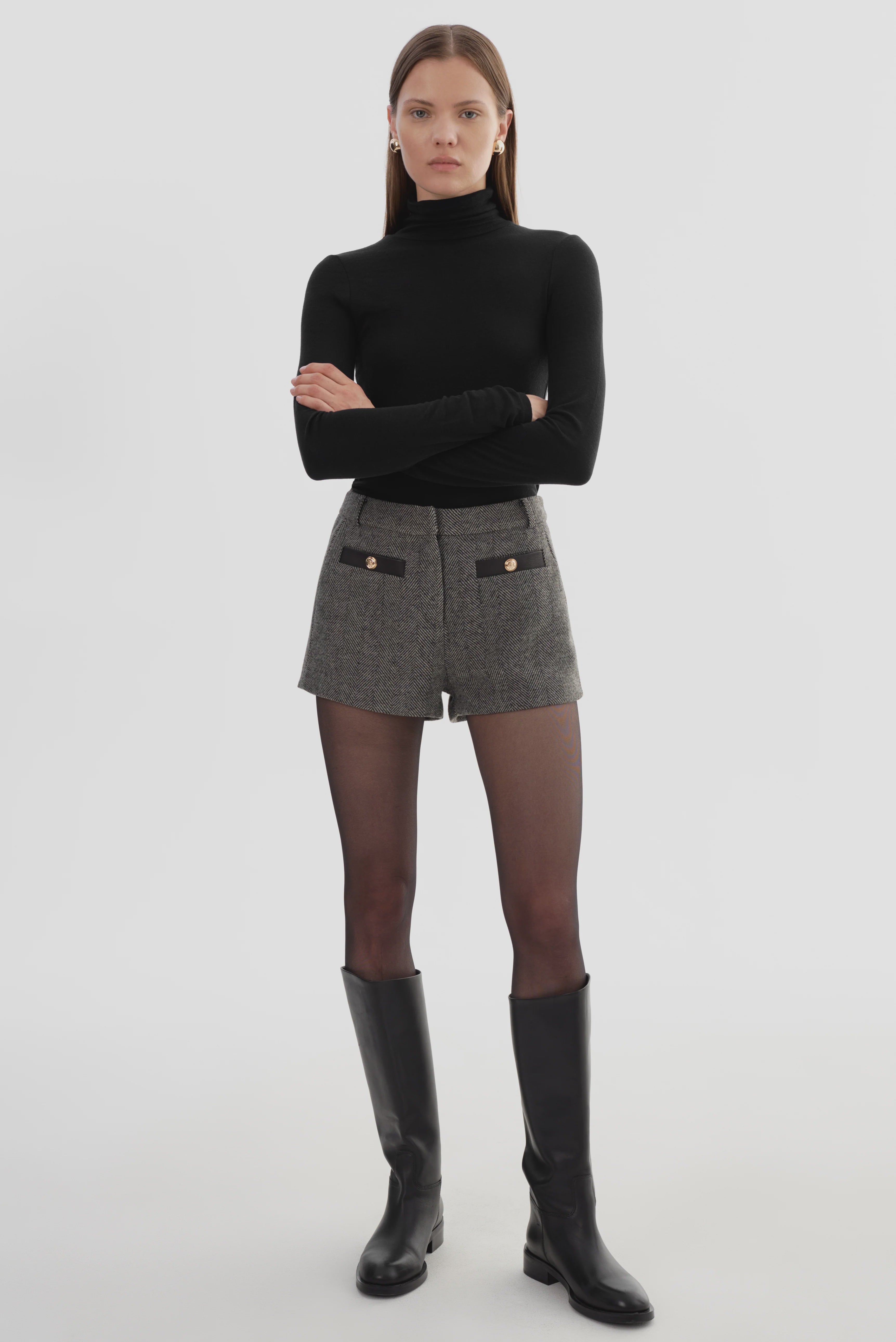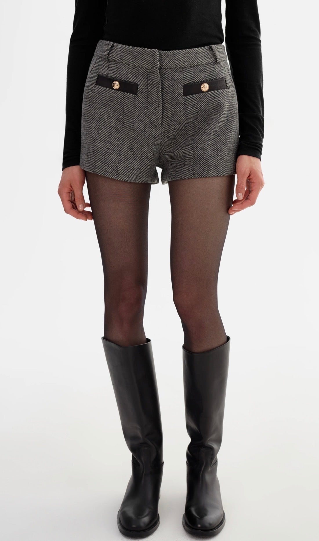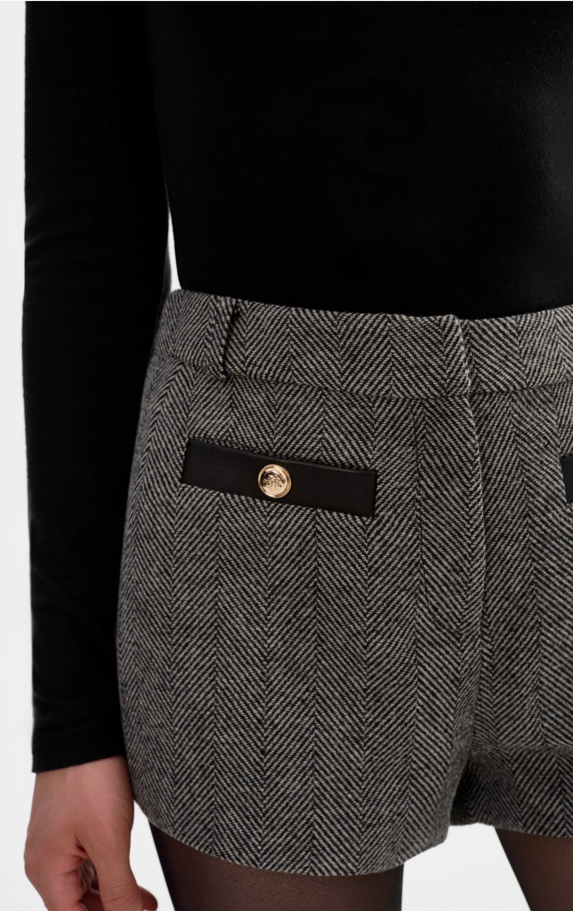 A polished update to classic tailoring. The AMRITA Herringbone Mini Shorts are tailored in a timeless tweed pattern and detailed with contrast leather trim and gold-tone buttons. Pair them with the EVIE blazer for a sharp, coordinated look.