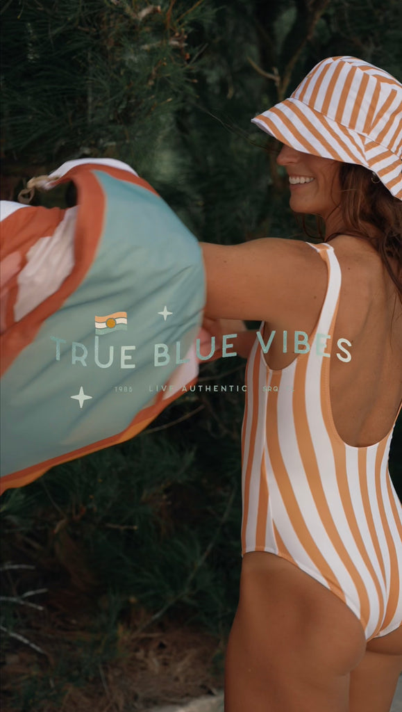 Dive into the heart of our True Blue Vibes ethos with a one-piece that’s as iconic as it is functional. Available in three signature designs—our fluid, sun-drenched Aura Print, the bold, statement-making Manifesto Print, and the Stripe Creamsicle, a fresh ode to our legacy branding—this suit blends performance with timeless style.