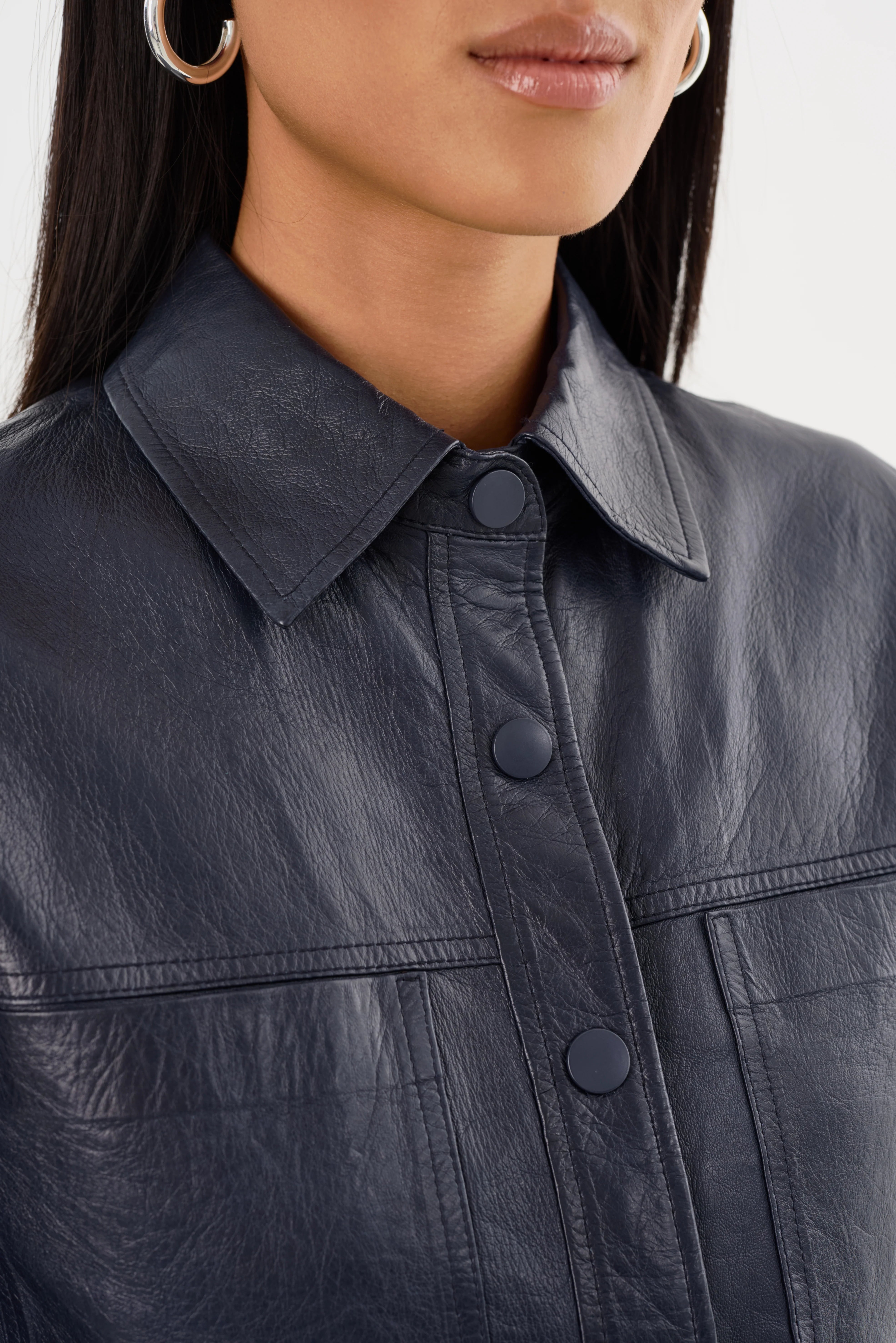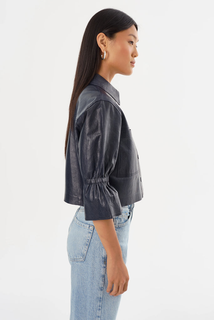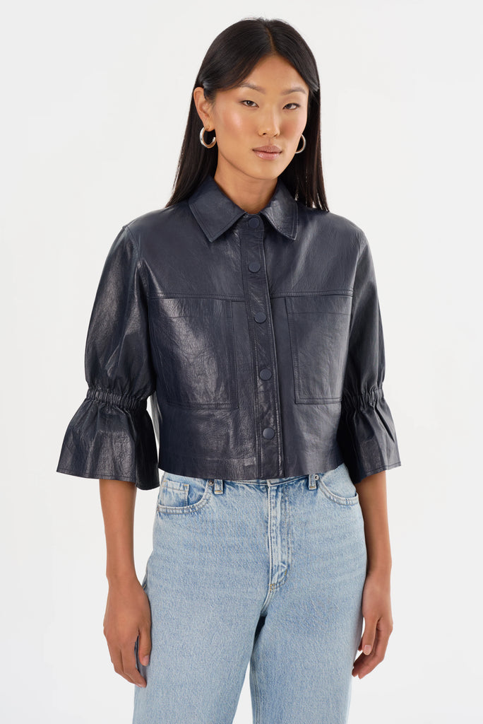 The CAROLINA Leather Ruffle Sleeve Jacket is a feminine twist on a classic shirt jacket. It features a cropped length and ruffled cropped sleeves for an unexpected playful silhouette. Pair it with jeans and a tee for a free-spirited off-duty look, or dress it up with the leather trousers and heels for a more sophisticated look.
