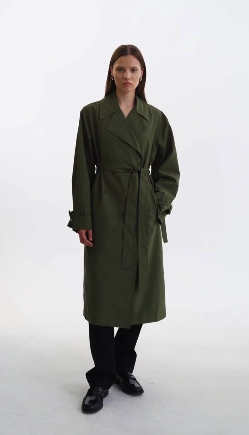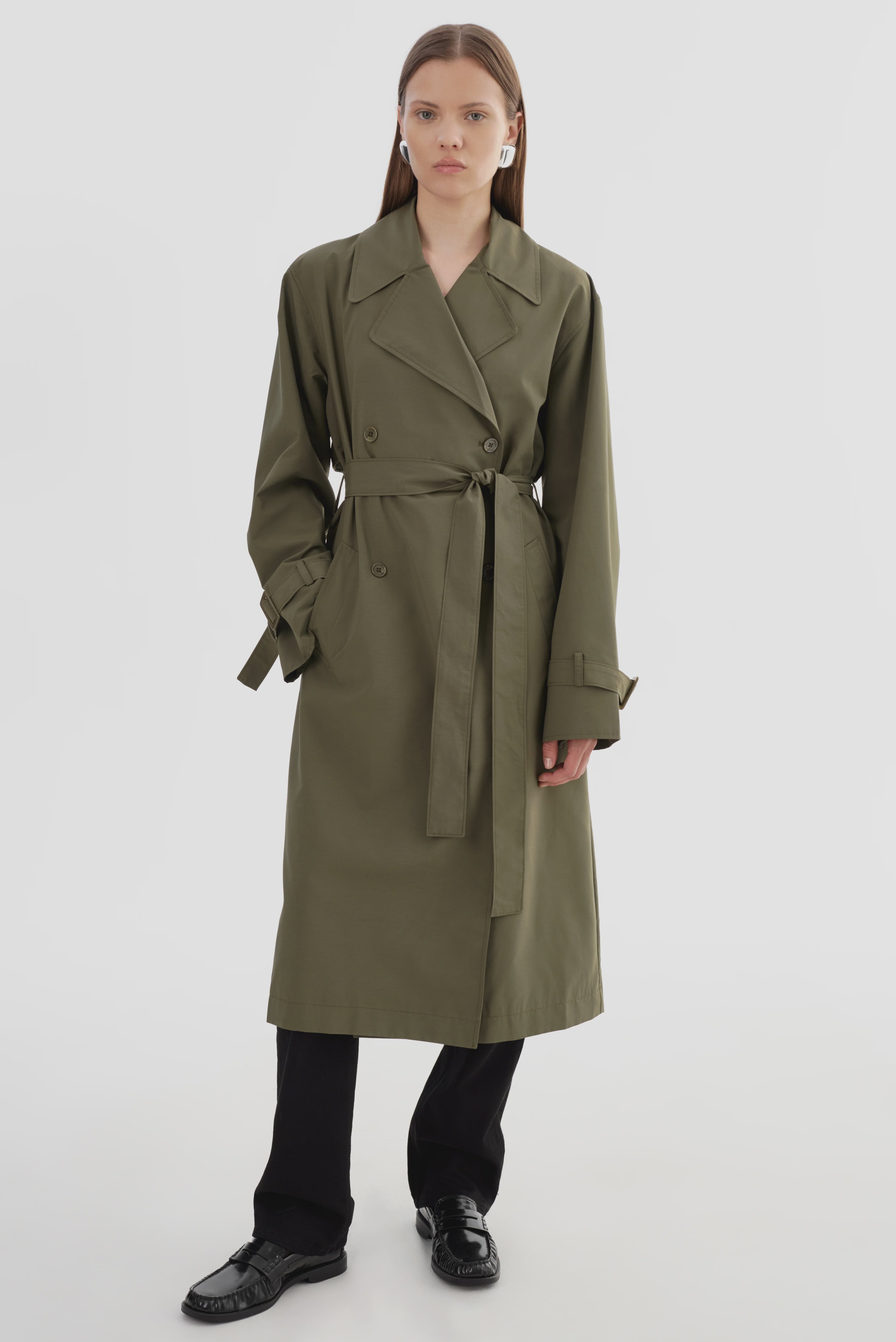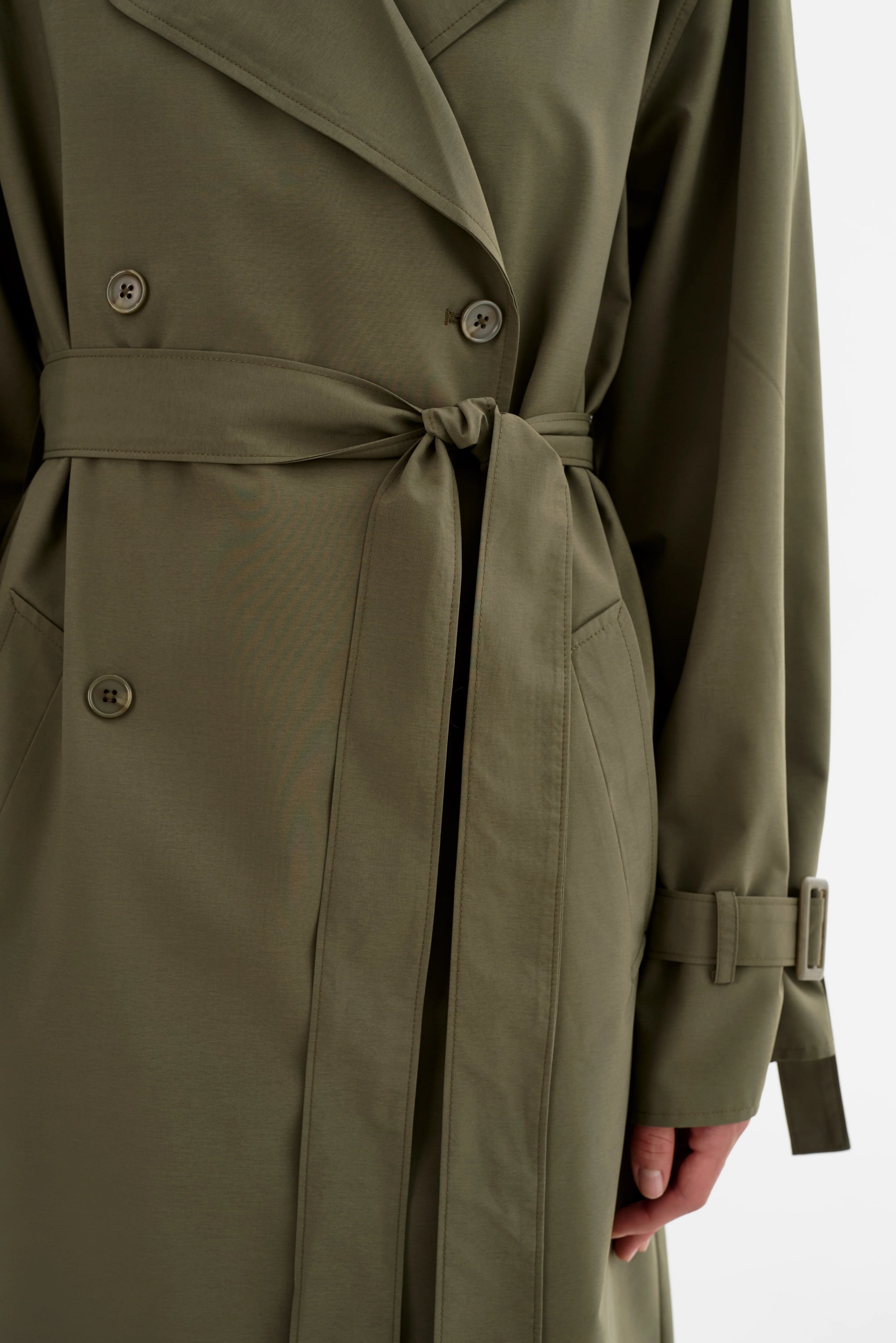 The COLETTE Trench Coat combines timeless trench design with a contemporary edge. Featuring a double-breasted button closure, self waist tie, and wide sleeves with buckle detailing, it offers a relaxed yet refined silhouette. A perfect transitional piece, it effortlessly layers over any outfit for an elevated touch.