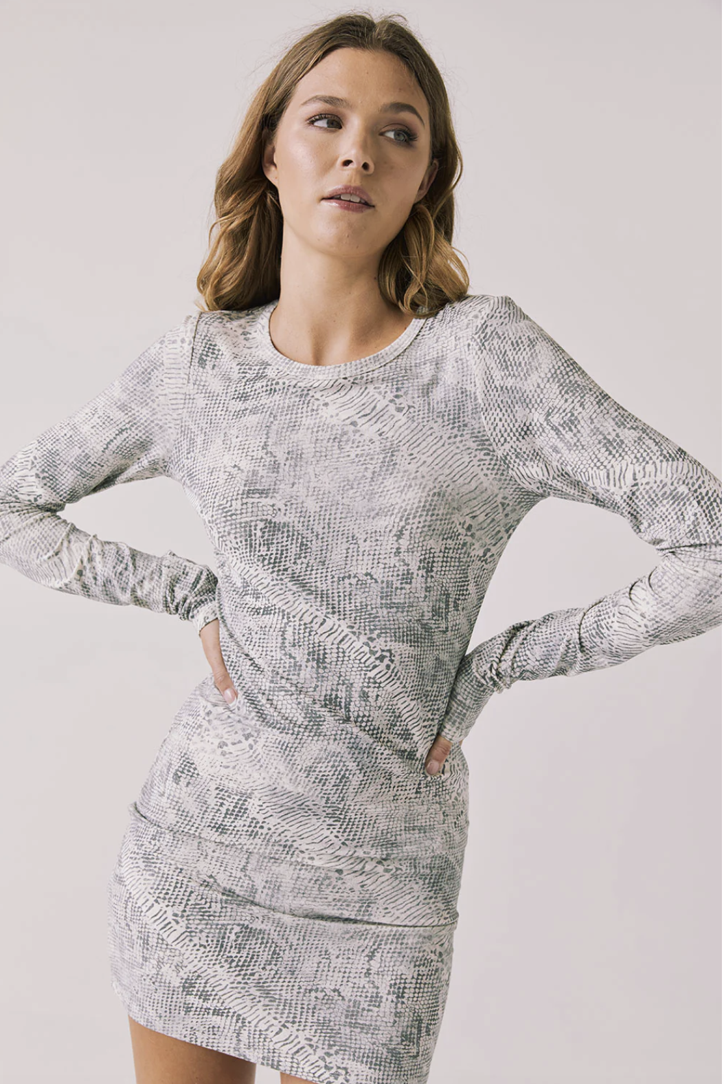 The Ziggy Python Print Mini Dress is a true staple with a sleek, elegant silhouette and a retro-inspired mini length.