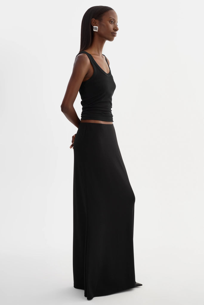 The JAZMIN Knit Maxi Skirt embodies understated elegance with its fluid, full-length silhouette. Designed with a fluid, floor-grazing silhouette, it features a sheer finish and a flexible waistband that sits comfortably at the waist. Effortlessly refined, it can seamlessly transition from day to night.