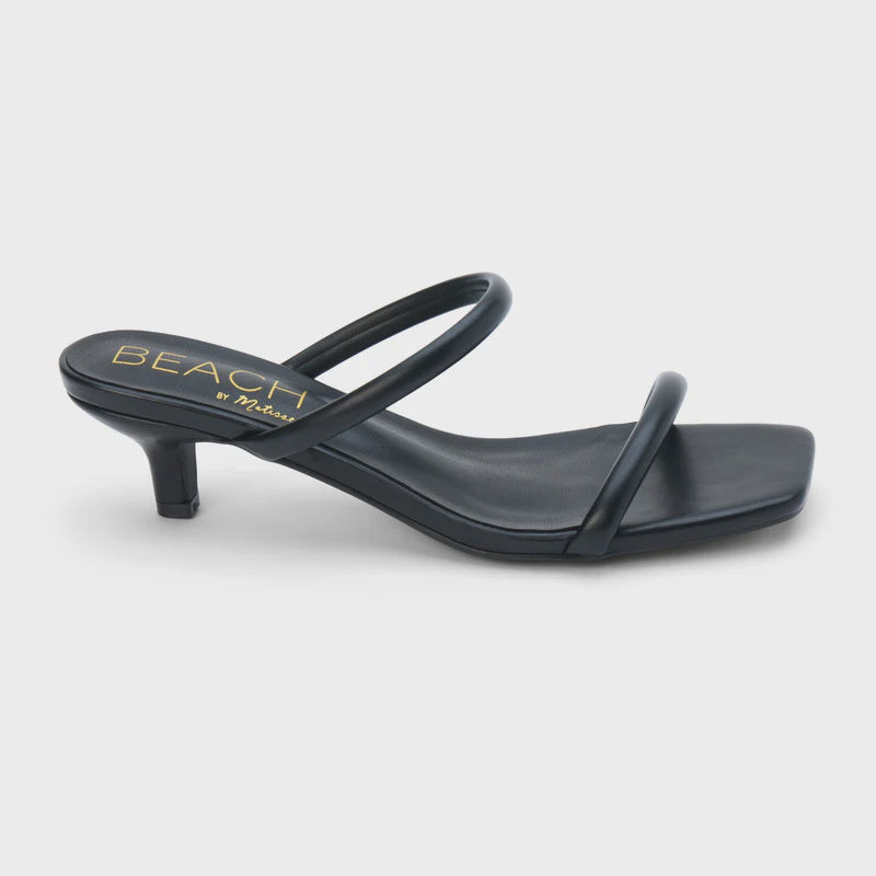 - Vegan double-strap sandal with low kitten heel and square toe.