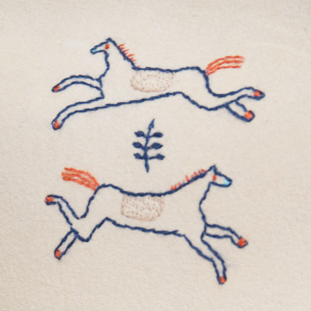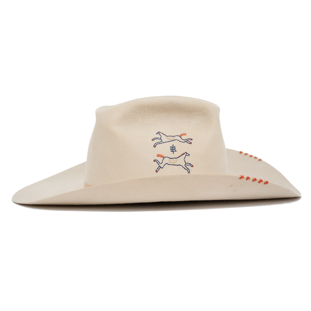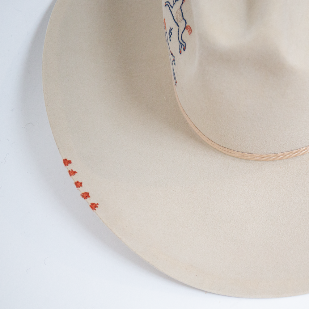 Tonal 2-ply ribbon band and bow Hand-embroidered horses and stitching on brim