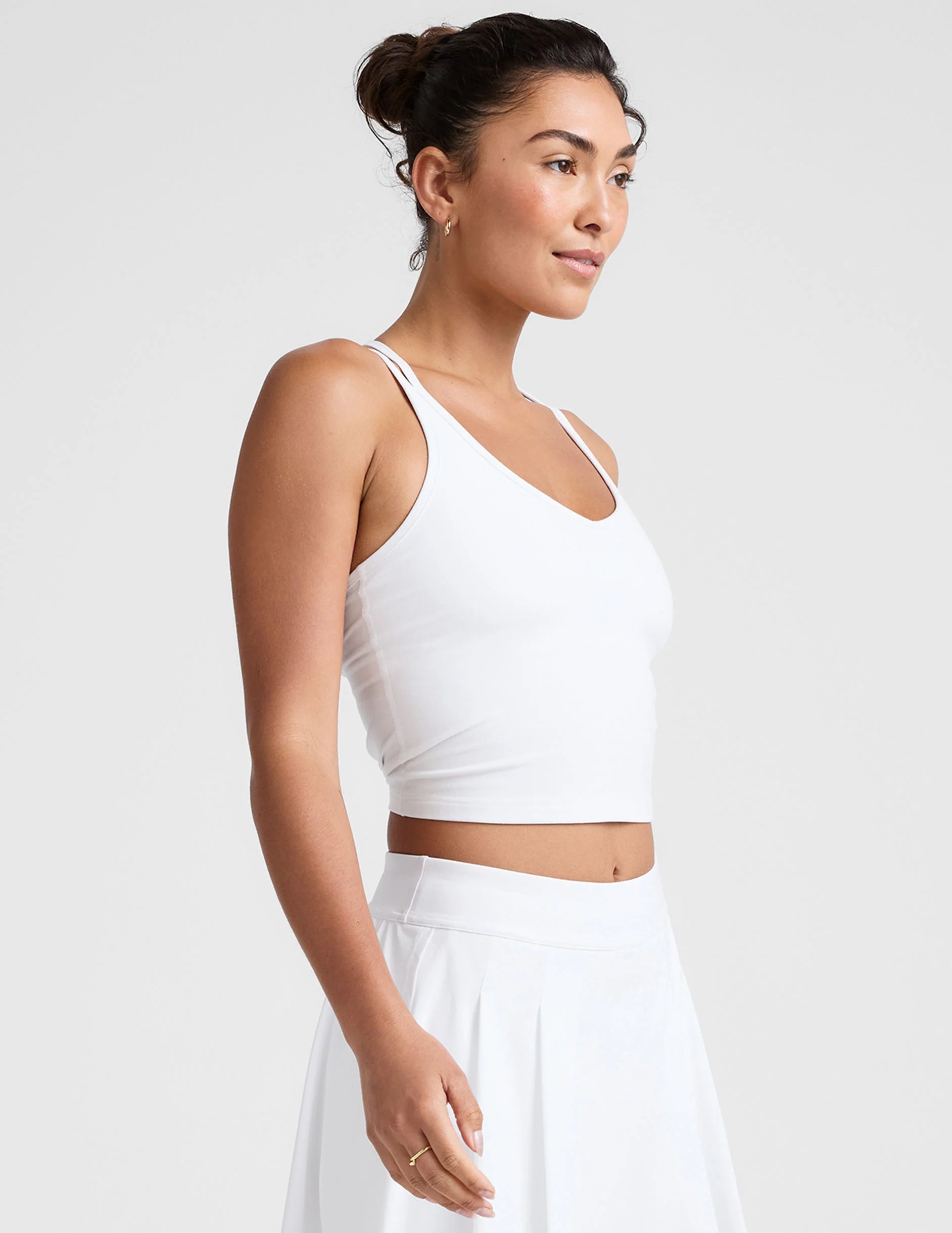 We love a strappy tank moment (who doesn't). Criss-cross straps paired with classic spaghetti straps at back, with a V-neckline at front, finished off with our wear-with-everything waist length. Did we mention a built-in bra? It just doesn't get any better.
